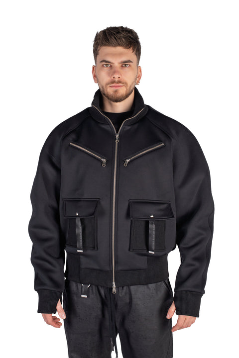 Jachetă cu structură arhitecturală realizată din neopren tehnic mat, cu un finisaj neted și volum controlat.