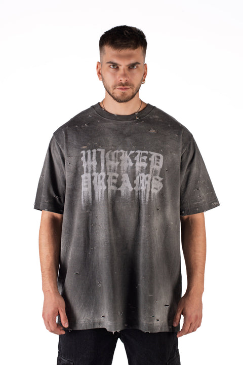Oversized t-shirt made from 100% cotton, hand-dyed for a washed and worn-in finish. Features all-over small distressed holes and a bold “WICKED DREAMS” front print with a spray-paint effect. Each piece is individually treated for a unique look.