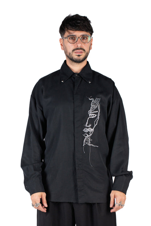 Oversized black cotton shirt with a soft, medium-weight texture and relaxed drape.